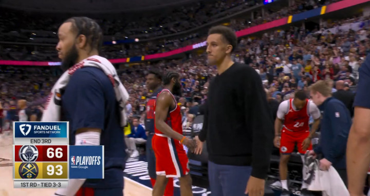 第三节最后时刻,穆雷接连两次上篮得手,分差甚至来到29分。伦纳德和哈登表情凝重,显然已经预见到了淘汰的结局。随着布劳恩第三节独得9分,掘金以93-66领先27分结束第三节彻底沦为垃圾时间!
